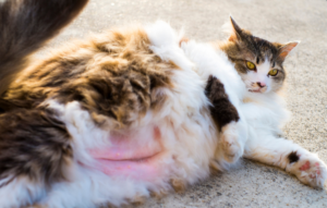 Many cats have what is known as a “primordial pouch.” A primordial pouch is a flap of extra skin that hangs down on your cat’s belly. This is completely normal and different from fat. The difference between fat and a primordial pouch is that the skin will be flat along your cat’s belly while fat will hang more heavily.
